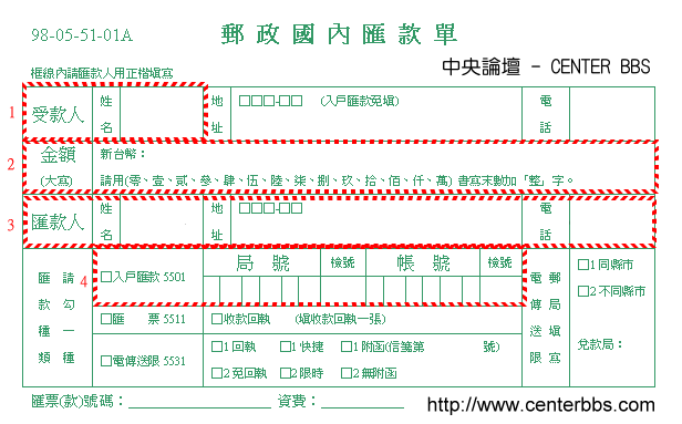 ‧單子最右邊有匯款額和匯費兩欄請勿填寫,郵局人員會用電腦印列。