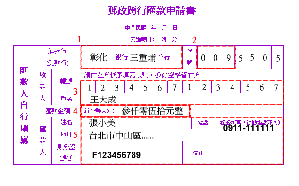 ‧單子最右邊有匯款額和匯費兩欄請勿填寫,郵局人員會用電腦印列。
